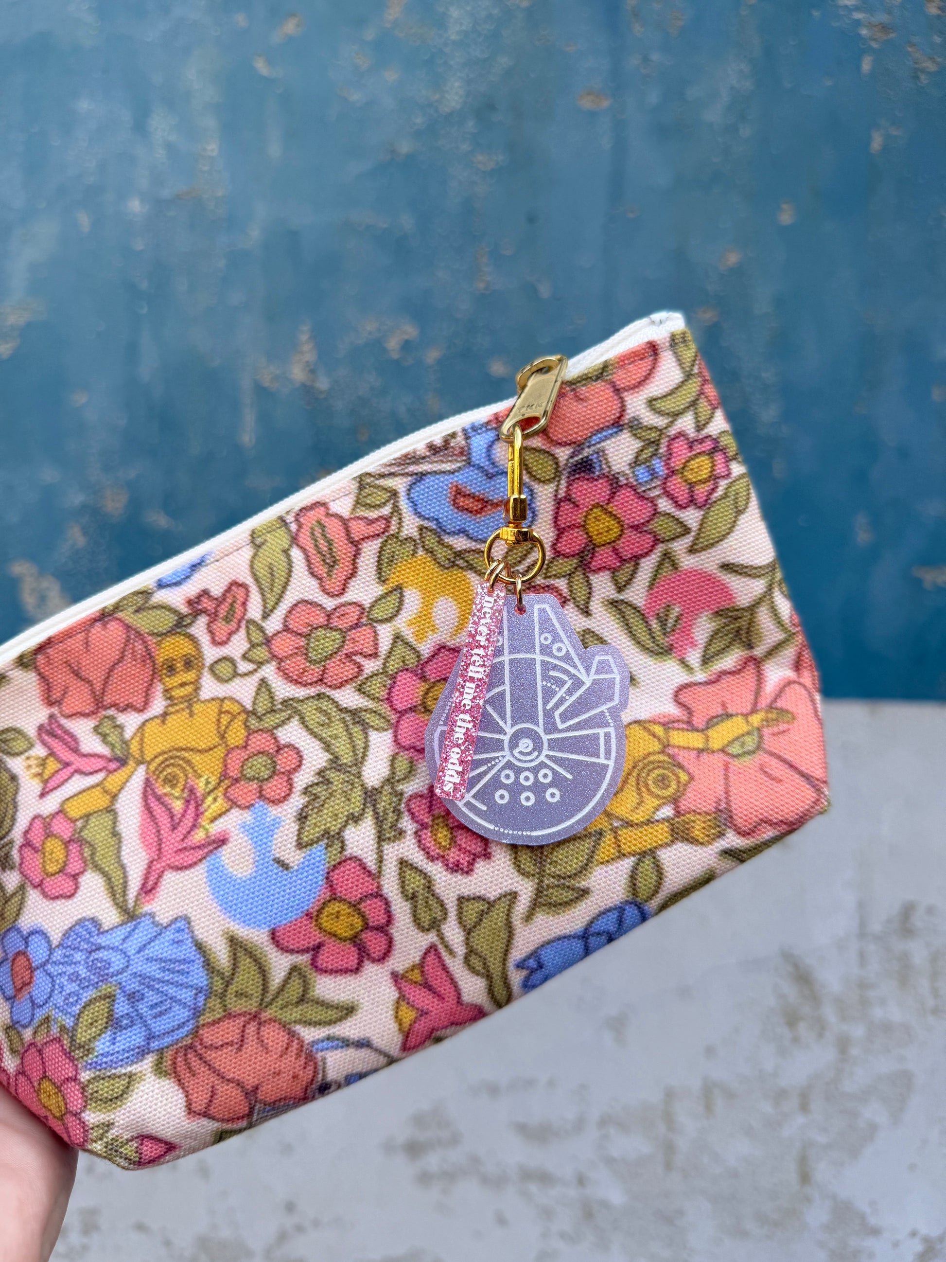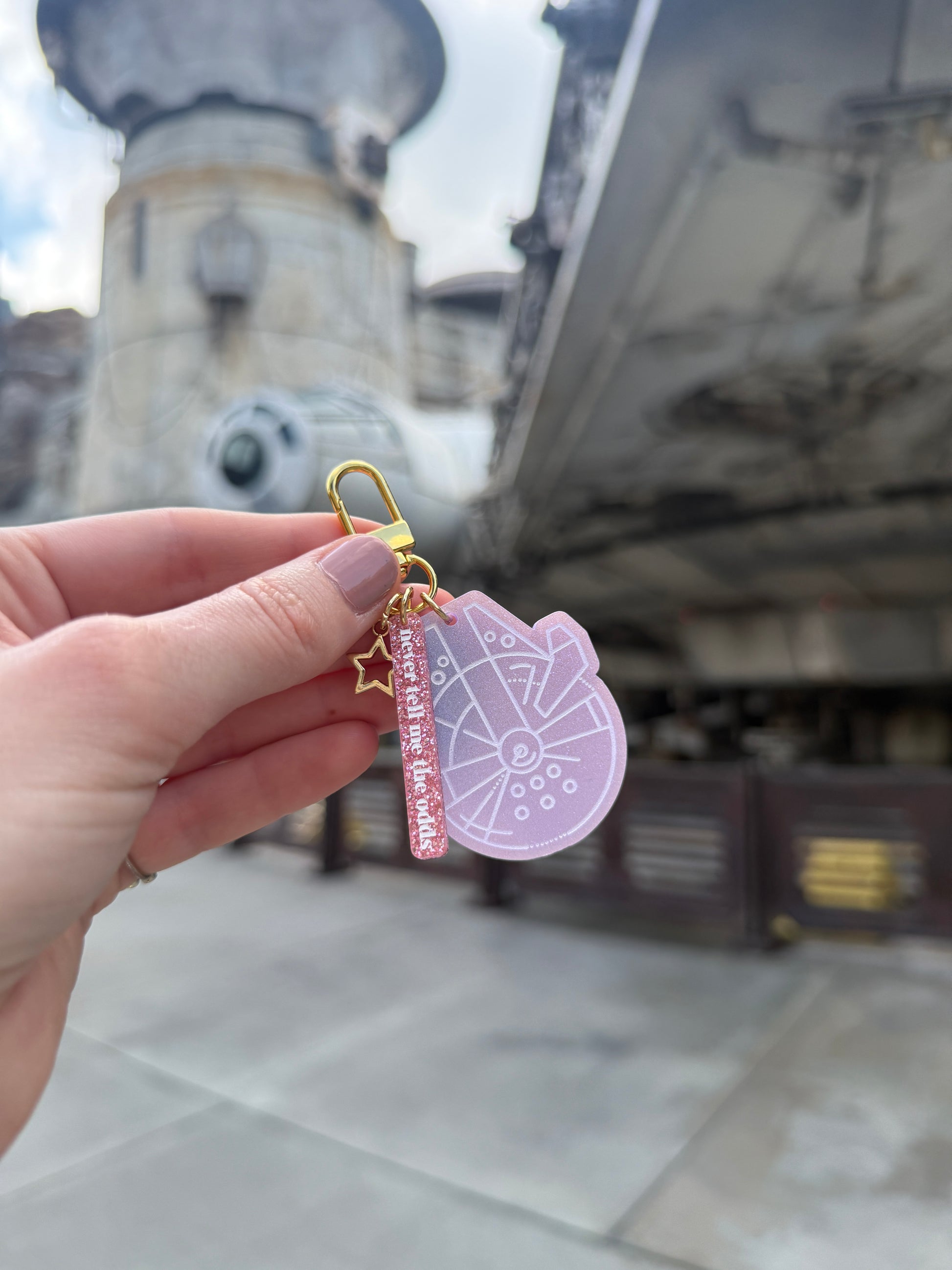 ✦Engraved with Paint Fill acrylic bag charm set with galaxy ship charm, never tell me the odds charm, and gold metal star charm or gold metal and black enamel star charm