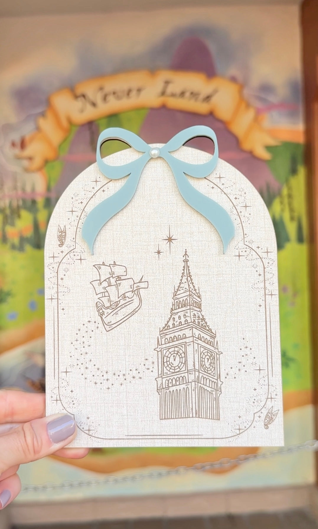 ✦Made of engraved linen finish wood veneer and light teal green, cream, or blue acrylic bow with pearl